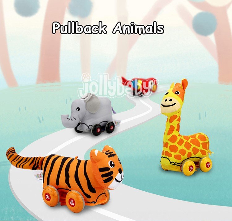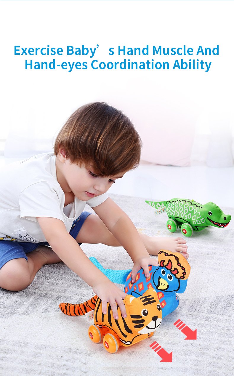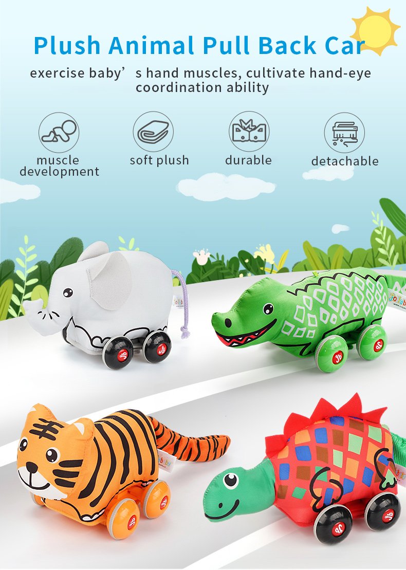 Polyester Washable Baby Educational Sensory Toy Stuffed Pull Back Animal Toy Soft Fabric.